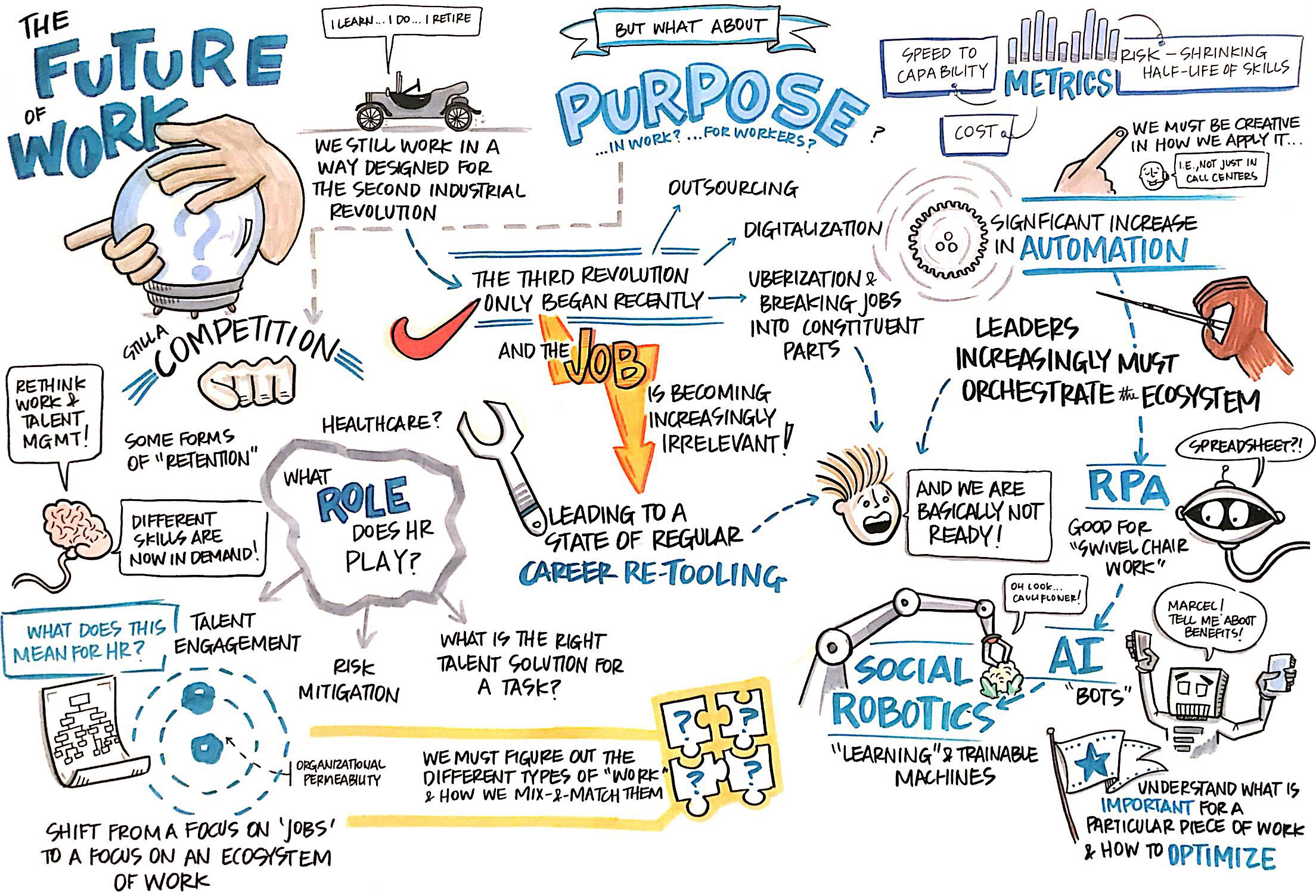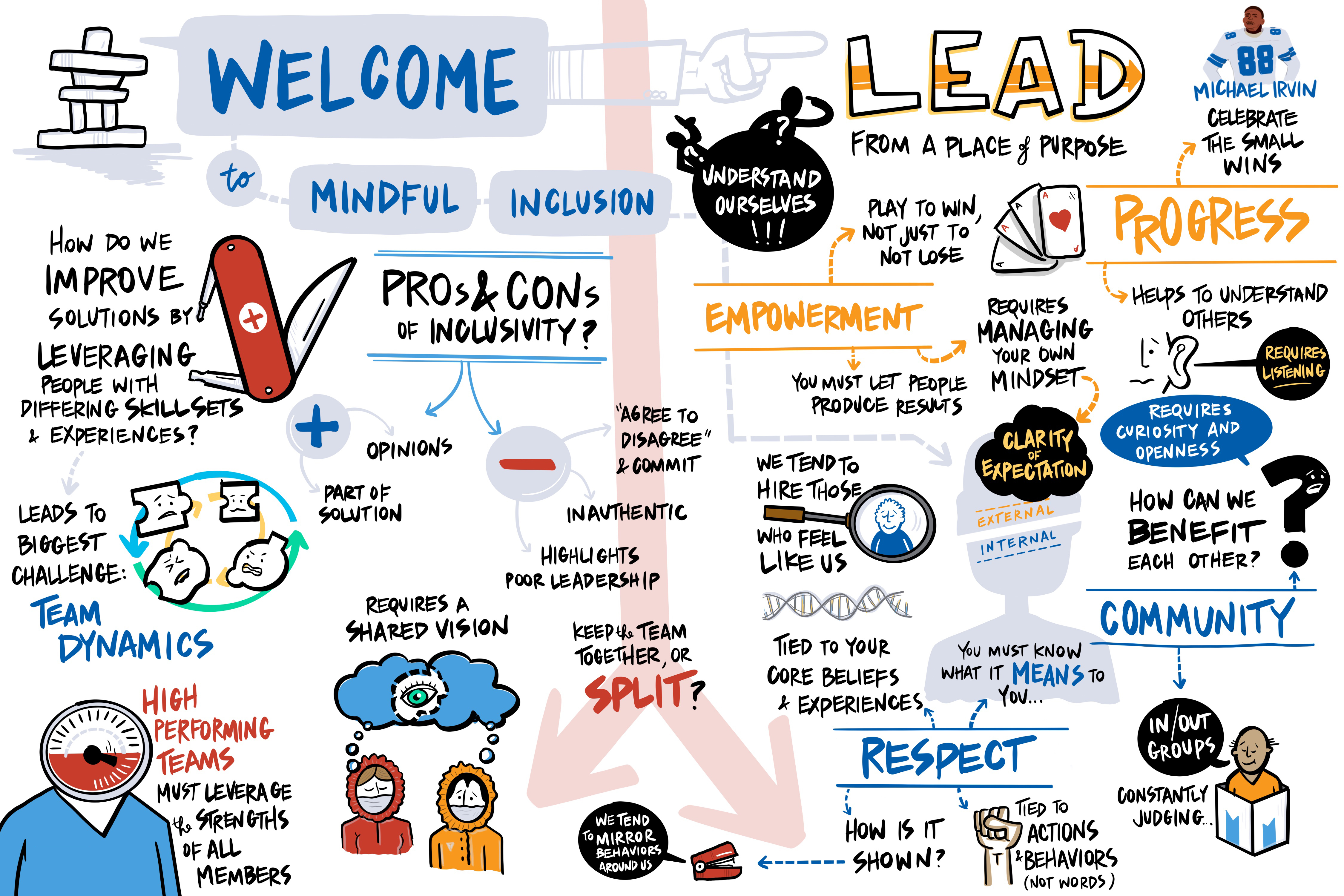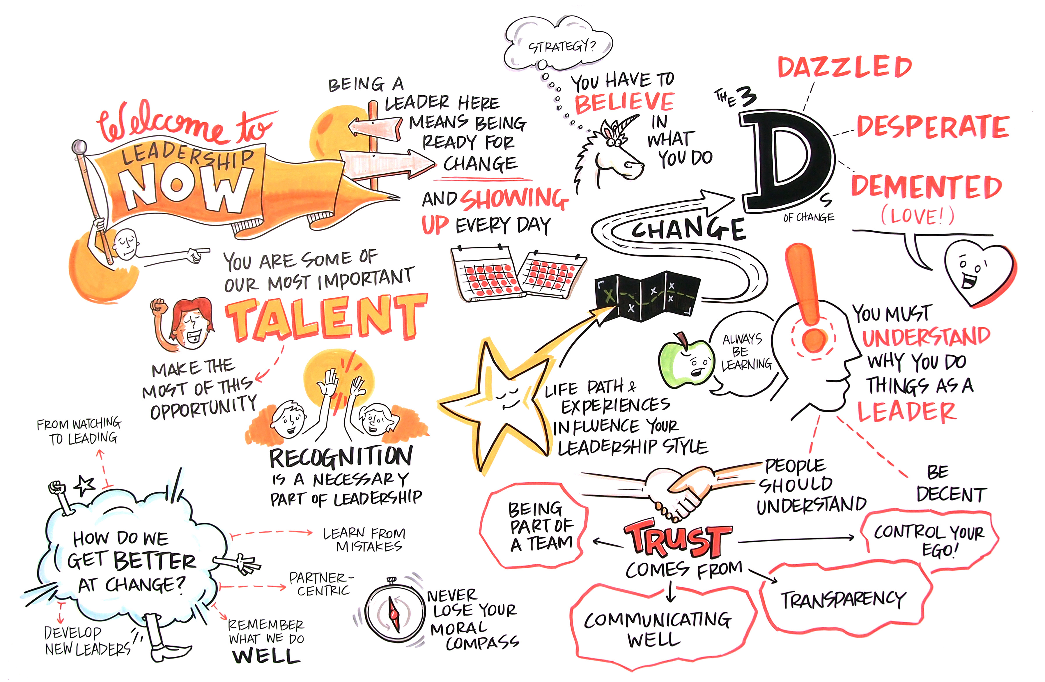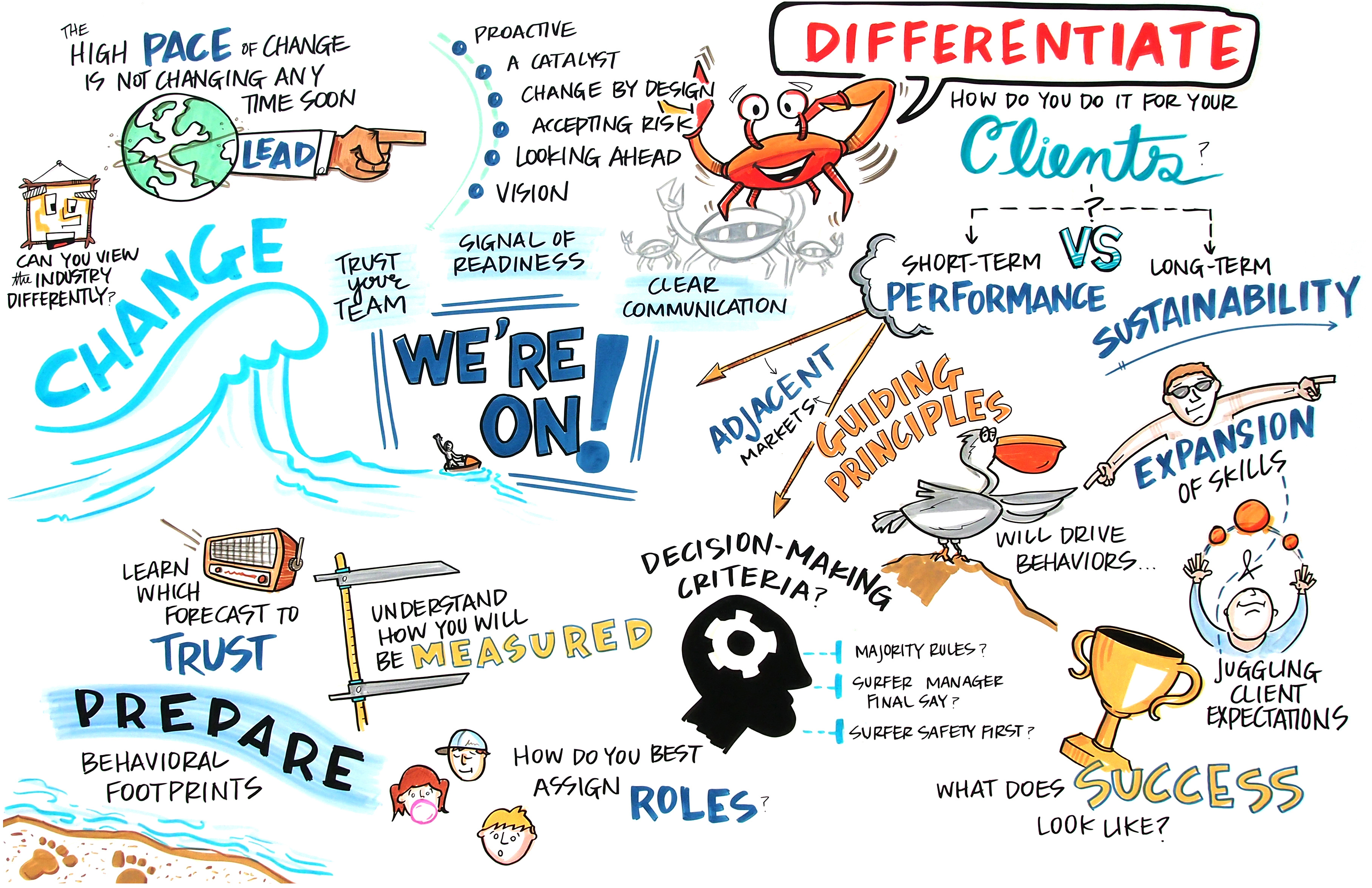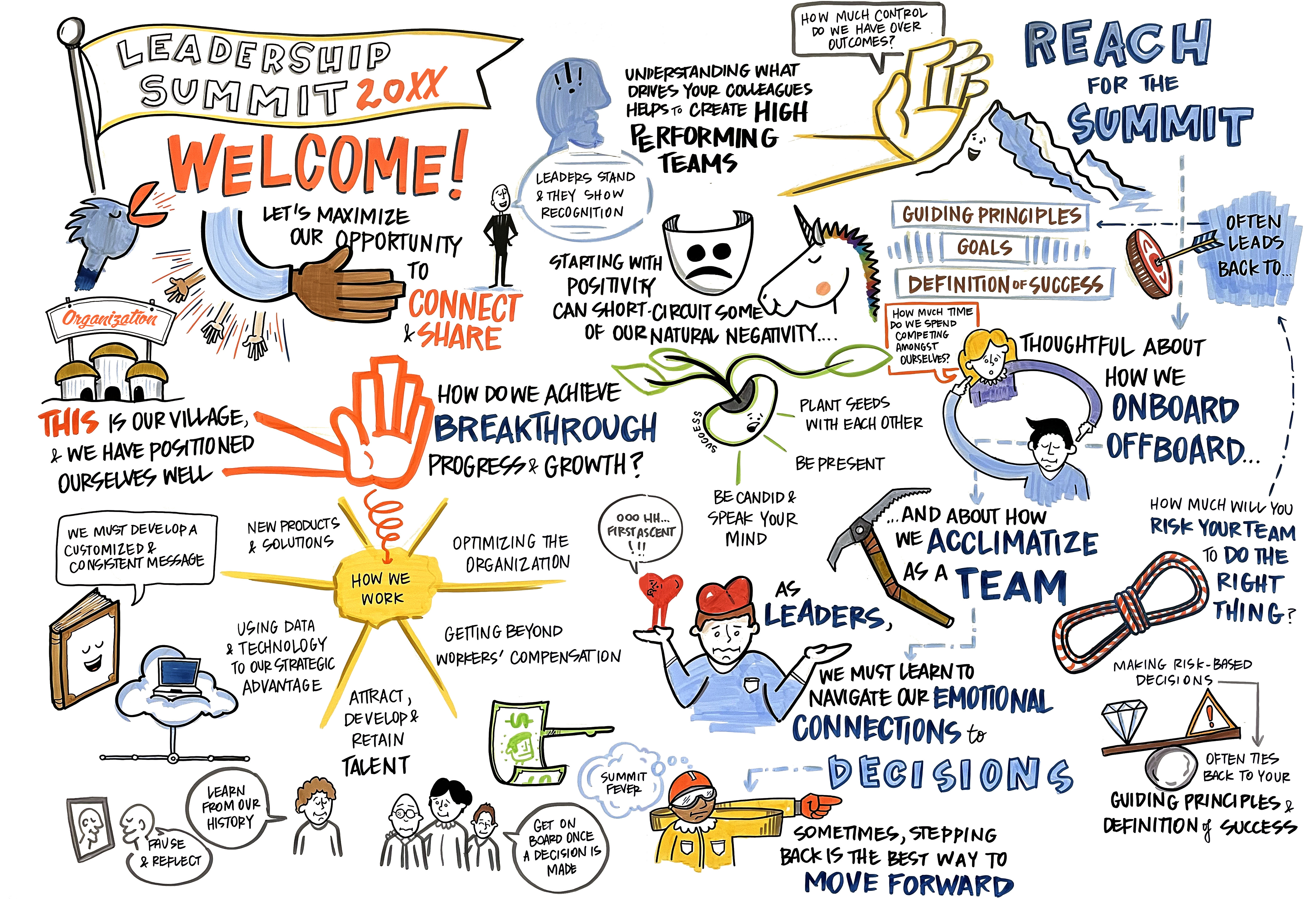 It is the the creation of hand-drawn visual notes for a meeting, keynote, or other large-scale gathering. Graphic recording is a wildly useful way to visualize key concepts, map complexity, and engage meeting participants. I typically draw in-person at a large scale, but graphic recording can also be useful in virtual settings.